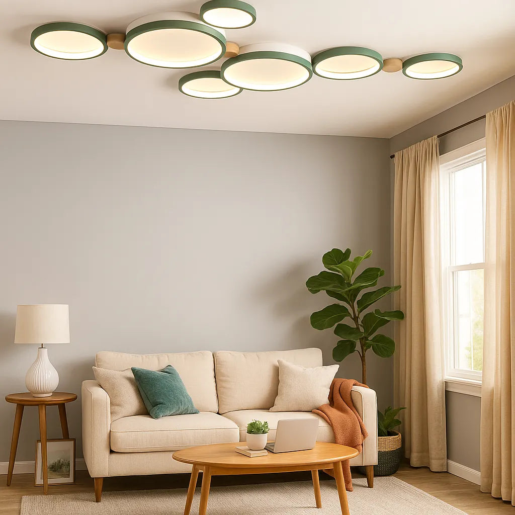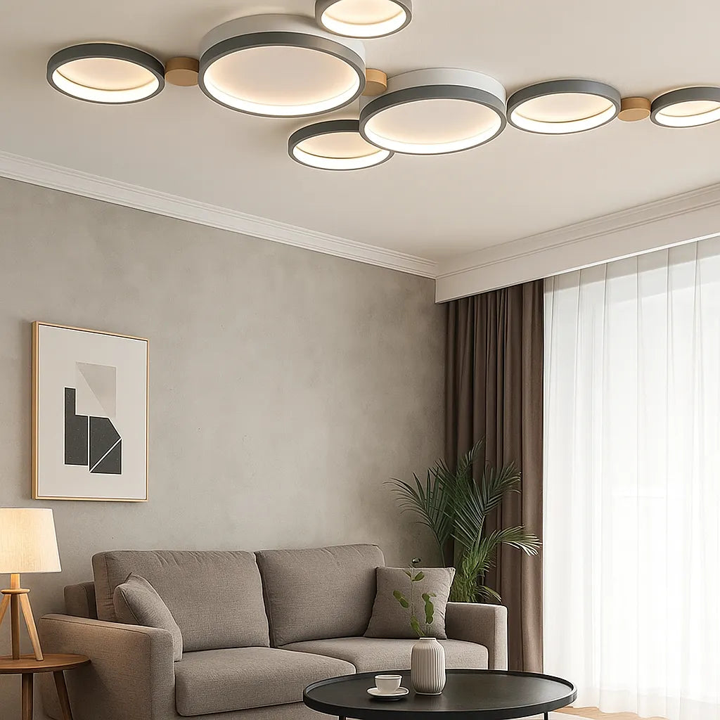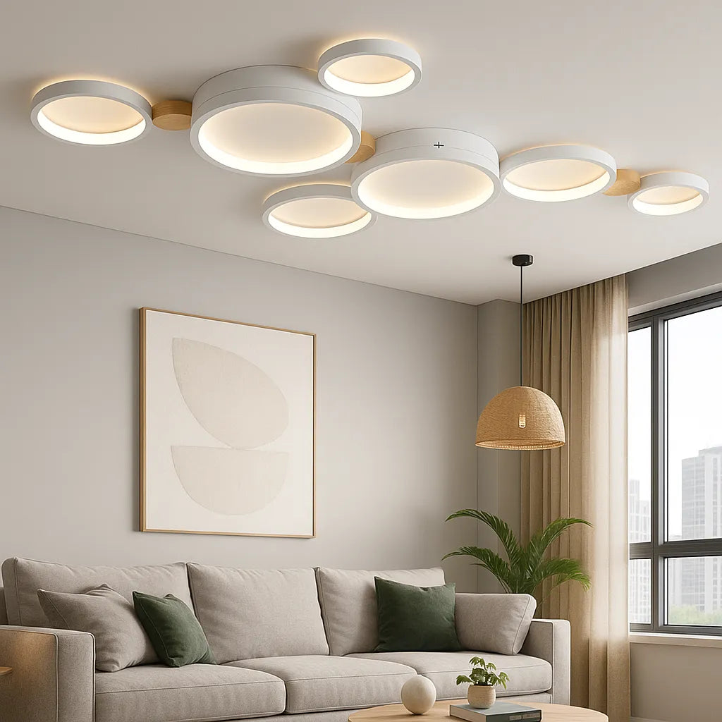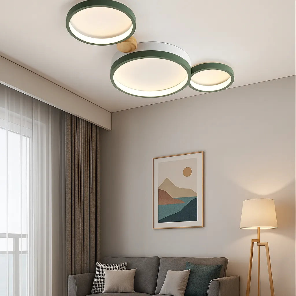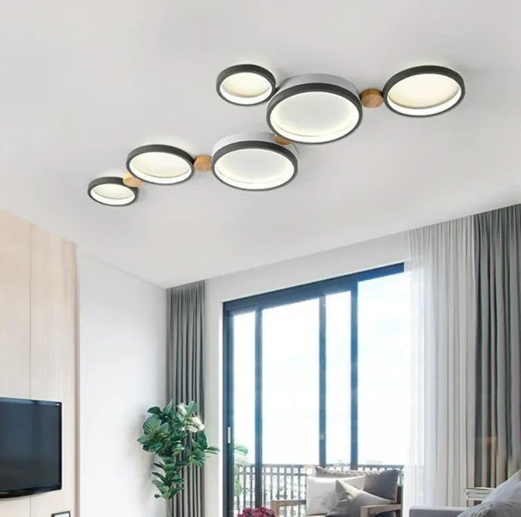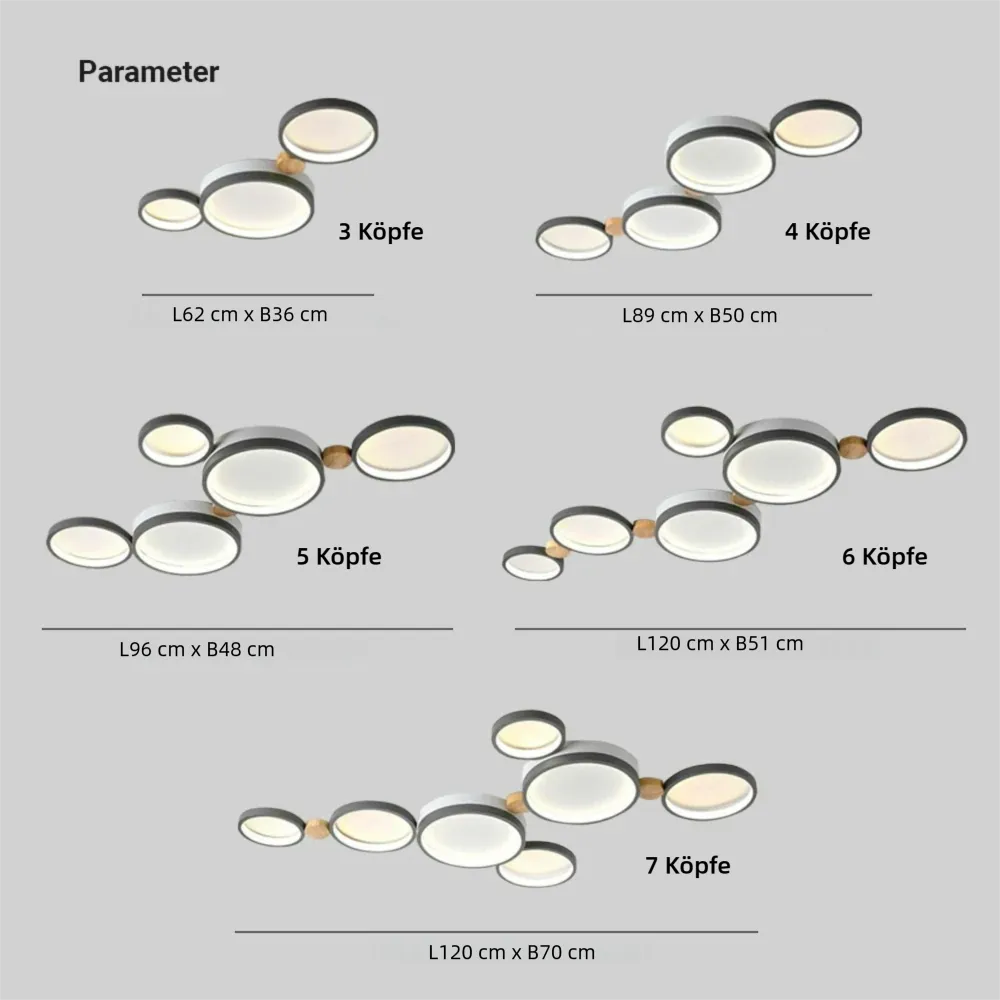 Die LED Deckenleuchte mit Ringen im Nordic Stil kombiniert modernes Design mit hoher Funktionalität. Hergestellt aus hochwertigem Eisen mit einer feinen matten Oberfläche und ergänzt durch Holzdetails, bietet sie einen energieeffizienten LED-Lichtstrahl in drei Farbtemperaturen. Ideal für Schlafzimmer und Wohnzimmer, schützt die Leuchte die Augen und sorgt für eine angenehme Atmosphäre, die gleichzeitig Wärme und Natürlichkeit in den Raum bringt.