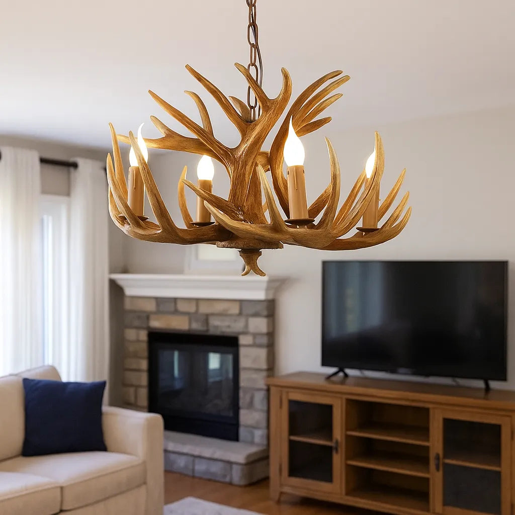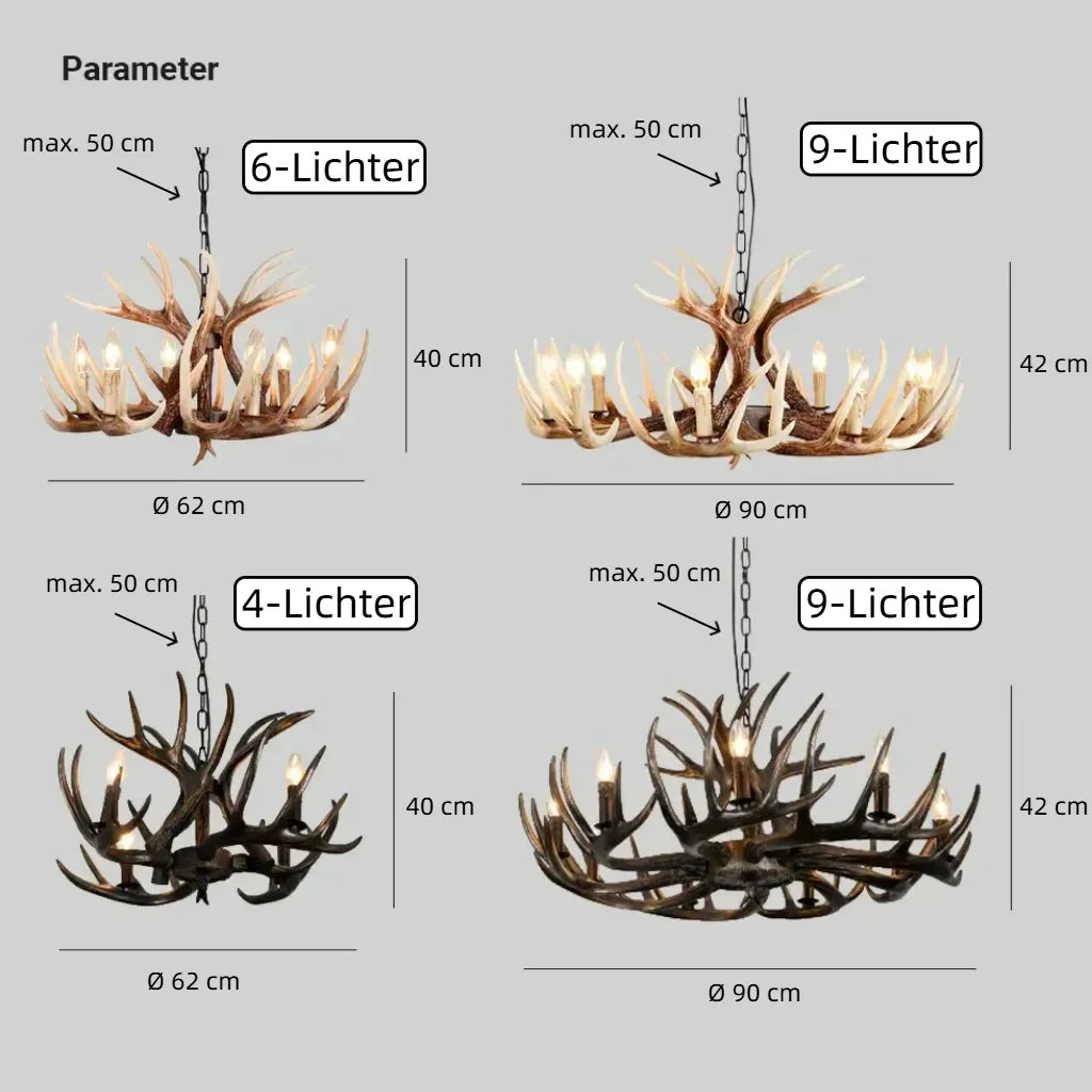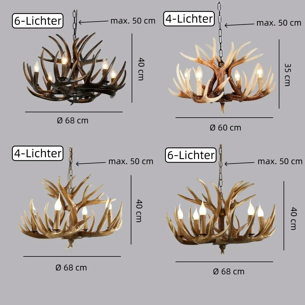 Der rustikale Kronleuchter im Landhausstil beeindruckt mit seinem einzigartigen Geweih-Design und den eleganten Kerzenhaltern. Die lebensechten, im Detail gearbeiteten Geweihe aus hochwertigem Resin bieten eine rustikale, natürliche Optik. Die E14-Lampenfassung sorgt für hervorragende Lichtdurchlässigkeit und schafft eine gemütliche Atmosphäre. Wählen Sie aus drei verschiedenen Farben, die zu jedem Landhausstil passen.