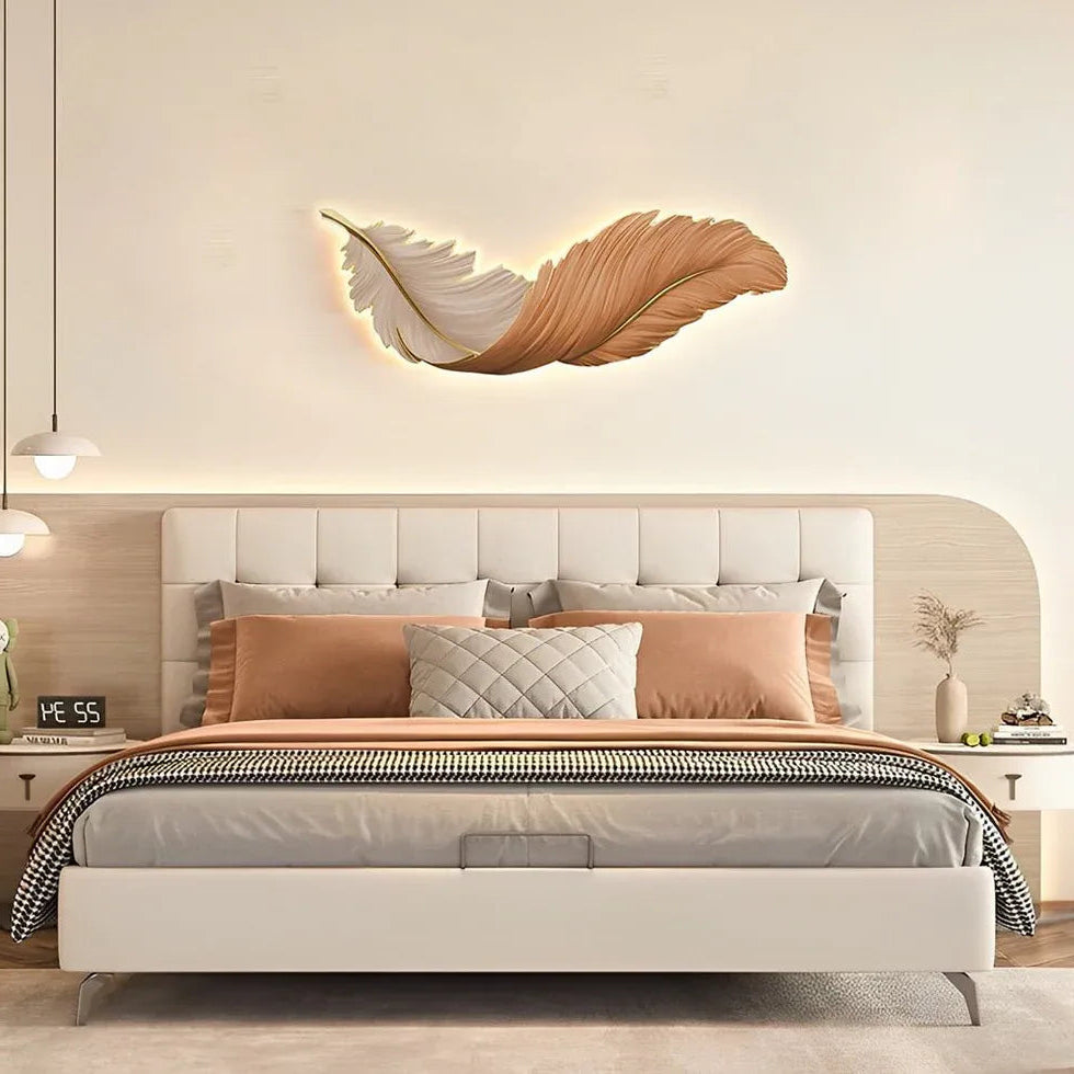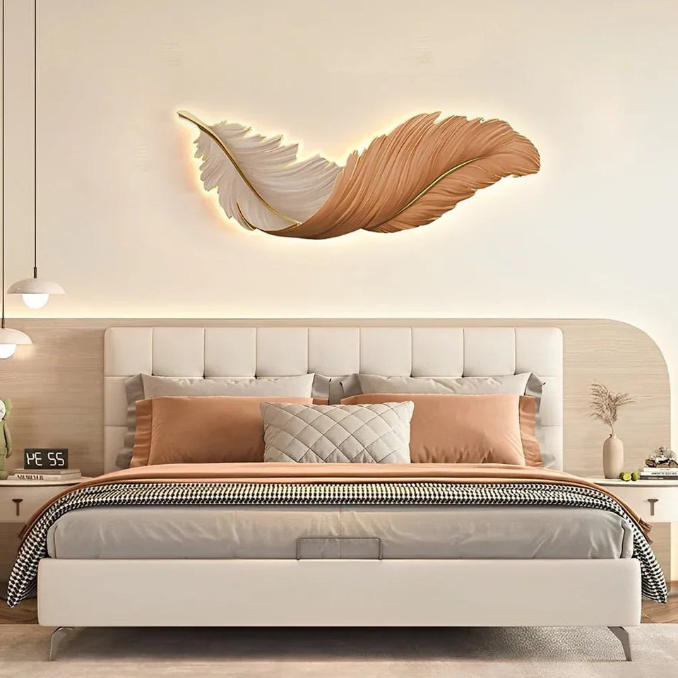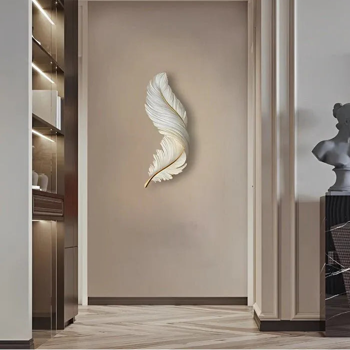 Moderne LED-Wandleuchte in eleganter Feder-Optik – kunstvoll gefertigt mit brillanter Kristallglasur und feuchtigkeitsbeständiger Rückplatte. Der hochwertige, energiesparende LED-Streifen sorgt für sanftes Licht. Als Wandbild und Beleuchtung einsetzbar. Mit Stecker, in drei Farben, ideal für Schlafzimmer, Wohnzimmer und Essbereich.