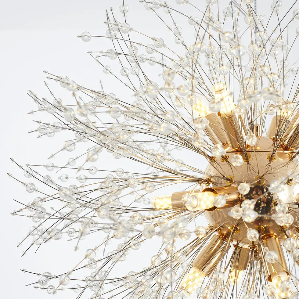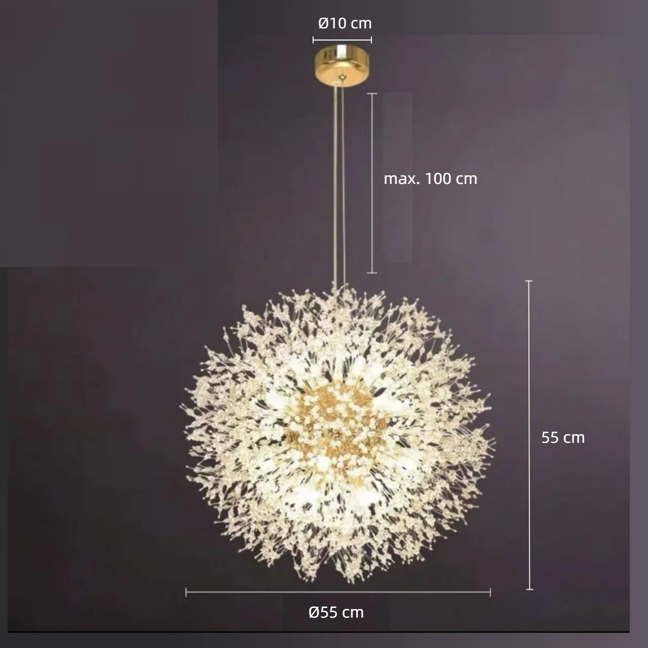 Der moderne Kristall-Kronleuchter im eleganten Dandelion-Design bringt luxuriösen Glanz in Ihr Esszimmer. Der galvanisierte Eisenrahmen ist korrosions- und rostbeständig, während der diamantgeschliffene Kristallschirm für funkelnde Lichtreflexe sorgt. Ausgestattet mit energieeffizienten G9-LED-Lampen bietet er gleichmäßiges, blendfreies Licht und dreifach einstellbare Farbtemperaturen. Erhältlich in zwei Farben, perfekt für verschiedene Einrichtungsstile.