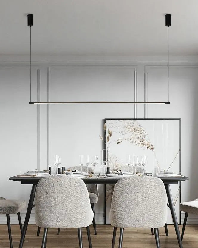 Diese dimmbare Pendelleuchte im linearen Design vereint Schlichtheit und Stil. Der robuste Lampenkörper aus hochwertiger Aluminiumlegierung und die verstärkte Eisen-Deckenhalterung garantieren Stabilität und Langlebigkeit. Hochwertige LED-Chips sorgen für flimmerfreies, augenschonendes Licht mit hoher Farbwiedergabe. Ideal für das Esszimmer, wo modernes Design auf Funktionalität trifft.