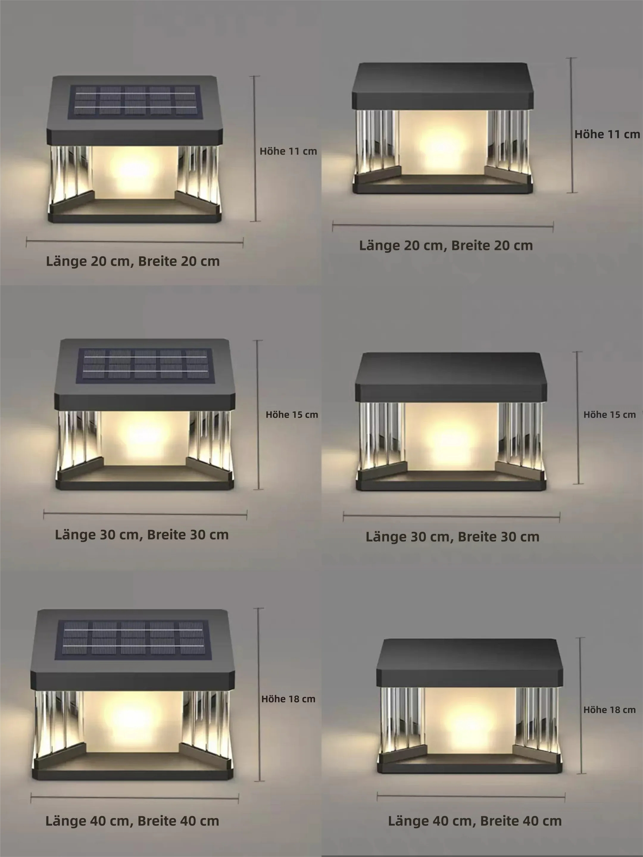 Die elegante, quaderförmig Solar LED Sockelleuchte in Schwarz überzeugt mit einem klaren, modernen Design und hochwertigem, hochtransparentem Acrylglas. Dank integriertem Solarmodul lädt sich die Leuchte tagsüber automatisch auf und spendet bei Einbruch der Dunkelheit angenehmes LED-Licht. Mit der Schutzklasse IP65 ist die Solarleuchte wasserdicht, wetterfest und ideal für den ganzjährigen Einsatz im Außenbereich geeignet. Sie ist energiesparend, umweltfreundlich und bietet eine langlebige LED-Lichtquelle für eine zuverlässige Beleuchtung von Wegen, Terrassen oder Gärten.
